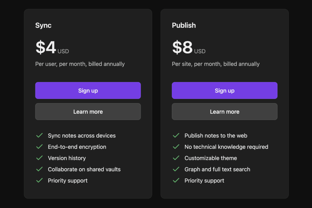 For those wanting a more seamless experience, Obsidian provides optional paid add-ons: Sync starts at $4 per user per month (billed annually) for end-to-end encrypted cross-device syncing, version history, and more advanced features in higher tiers; Publish runs $8 per site per month (billed annually) for effortlessly sharing selected notes online with custom domains and themes. Individuals can also grab a one-time Catalyst license starting at $25 for early beta access and insider perks as a way to back the developers.